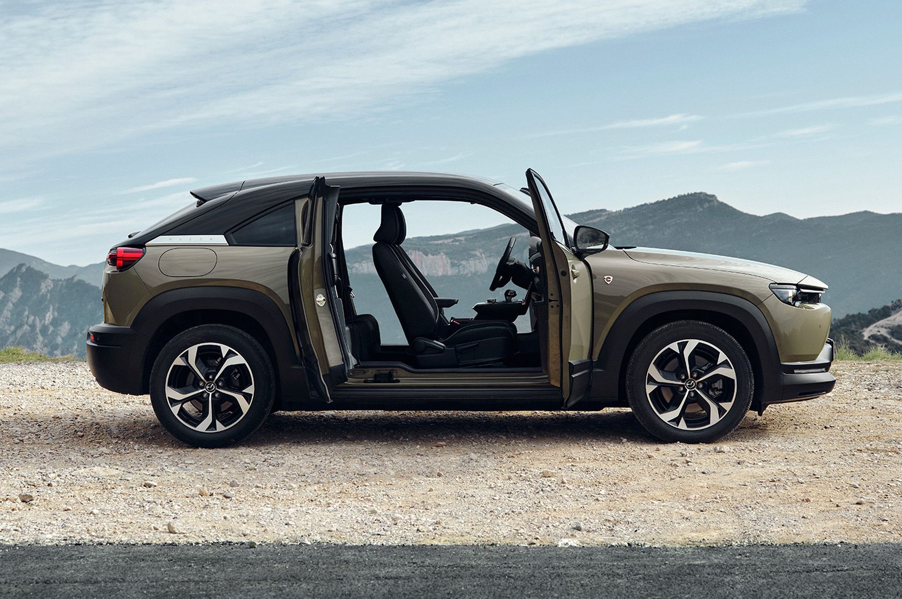 Mazda MX-30 to samochód, który wyróżnia się swoją oryginalną stylistyką i wyrazistym wyglądem. Jest zwinny i kompaktowy, dzięki czemu świetnie spisze się na wąskich miejskich uliczkach. Zwróćcie uwagę na nietypowy sposób otwierania drzwi. Brak słupka B ułatwia wygodny dostęp do wnętrza, a tylne drzwi otwierają się w przeciwnym kierunku do przednich. Po zajęciu pozycji za kierownicą szybko docenicie wygodne fotele oraz świetną jakość wykończenia. Mazda MX-30 R-EV oferuje także bogate wyposażenie już w podstawowej wersji. Na pokładzie znajdziemy m.in. kamerę cofania oraz czujniki parkowania z przodu i z tyłu, a także system multimedialny Mazda Connect z 8,8-calowym wyświetlaczem i nawigacją. Z zewnątrz natomiast znajdziemy w pełni LED-owe reflektory z funkcją automatycznej zmiany ze świateł drogowych na mijania oraz chociażby 18-calowe felgi aluminiowe.