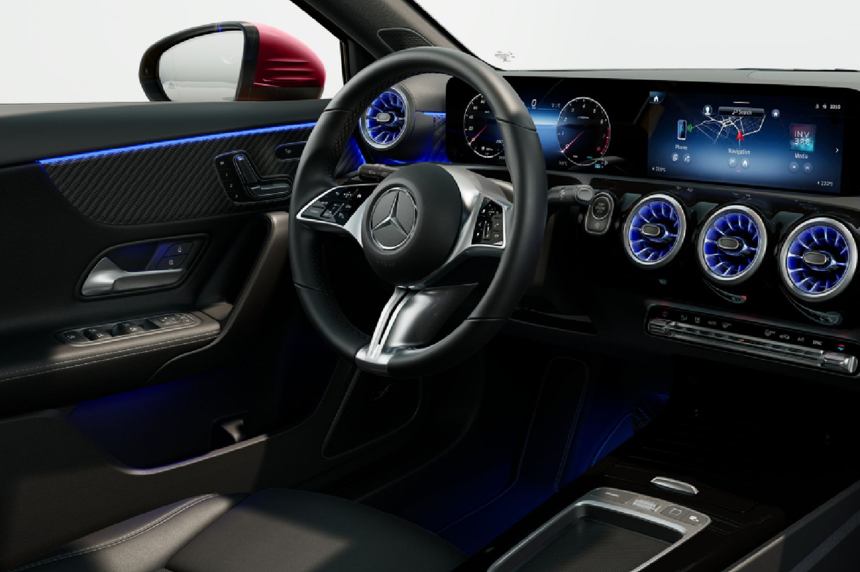 W Mercedesie klasy A komfort zaczyna się od foteli. Rozbudowana regulacja, w tym czterokierunkowe podparcie lędźwiowe, pozwala łatwo dopasować pozycję do sylwetki i odciążyć plecy. Wysuwana poduszka siedziska poprawia podparcie ud, co szczególnie docenią wyżsi kierowcy. Auto wyposażone jest również w podgrzewane fotele z trzystopniową regulacją. Całość uzupełnia automatyczna klimatyzacja THERMATIC, dbająca o stały komfort termiczny niezależnie od pogody. Wnętrze uzupełniają czarne, welurowe dywaniki z eleganckim obszyciem dopasowanym do kolorystyki kabiny. Nie tylko estetycznie dopełniają aranżację środka, ale też skutecznie chronią podłogę przed zabrudzeniami.
