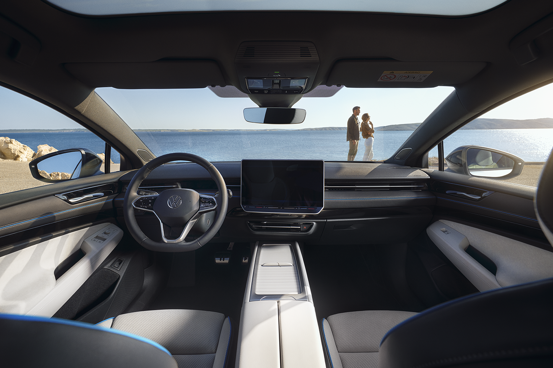 Kabina nowego Volkswagena ID.7 zapewnia nie tylko wygodną przestrzeń dla podróżujących w obu rzędach siedzeń, ale także przyjemność z obcowania z materiałami najwyższej jakości. Zasiadając we wnętrzu nietrudno dostrzec dbałość o najmniejsze szczegóły kokpitu. Elegancki charakter świetnie podkreśla obszerny opcjonalny dach panoramiczny, który może wpuszczać do środka mnóstwo światła dziennego lub zostać przyciemniony za pomocą jednego przycisku. Nowy ID.7 może być wyposażony w niezwykle wygodne fotele ergoActive Premium, które poza ergonomicznymi kształtami oferują także różne programy masażu, w tym także masaż okolic miednicy poprawiający krążenie i zmniejszający napięcie.